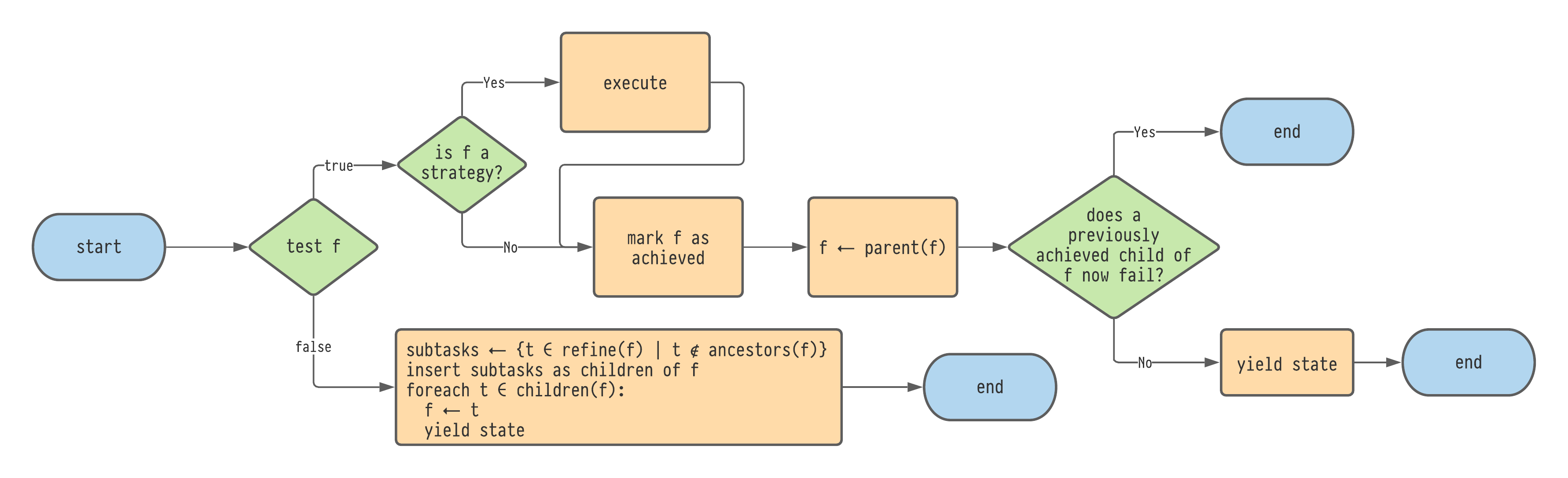 The subtasks algorithm employs a structure that is similar to a hierarchical task network (HTN) [Sac74[Sac74]Sacerdoti, Earl DPlanning in a hierarchy of abstraction spaces (1974)Artificial intelligencehttps://doi.org/10.1016/0004-3702(74)90026-5, Tat77[Tat77]Tate, AustinGenerating project networks (1977)Proceedings of the 5th International Joint Conference on Artificial Intelligence.https://dl.acm.org/doi/abs/10.5555/1622943.1623021, MS99[MS99]Melis, Erica; Siekmann, JΓΆrgKnowledge-based proof planning (1999)Artificial Intelligencehttps://doi.org/10.1016/S0004-3702(99)00076-4]. The general idea of a hierarchical task network is to break a given abstract task (e.g., "exit the room") in to a sequence of subtasks ("find a door" then "go to door" then "walk through the door") which may themselves be recursively divided into subtasks ("walk through the door" may have a subtask of "open the door" which may in turn have "grasp doorhandle" until bottoming out with a ground actuation such as "move index finger 10Β°"). This approach has found use for example in the ICARUS robotics architecture [CL18[CL18]Choi, Dongkyu; Langley, PatEvolution of the ICARUS cognitive architecture (2018)Cognitive Systems Researchhttps://doi.org/10.1016/j.cogsys.2017.05.005, LCT08[LCT08]Langley, Pat; Choi, Dongkyu; Trivedi, NishantIcarus userβs manual (2008)http://www.isle.org/~langley/papers/manual.pdf]. HTNs have also found use in proof planning [MS99[MS99]Melis, Erica; Siekmann, JΓΆrgKnowledge-based proof planning (1999)Artificial Intelligencehttps://doi.org/10.1016/S0004-3702(99)00076-4].