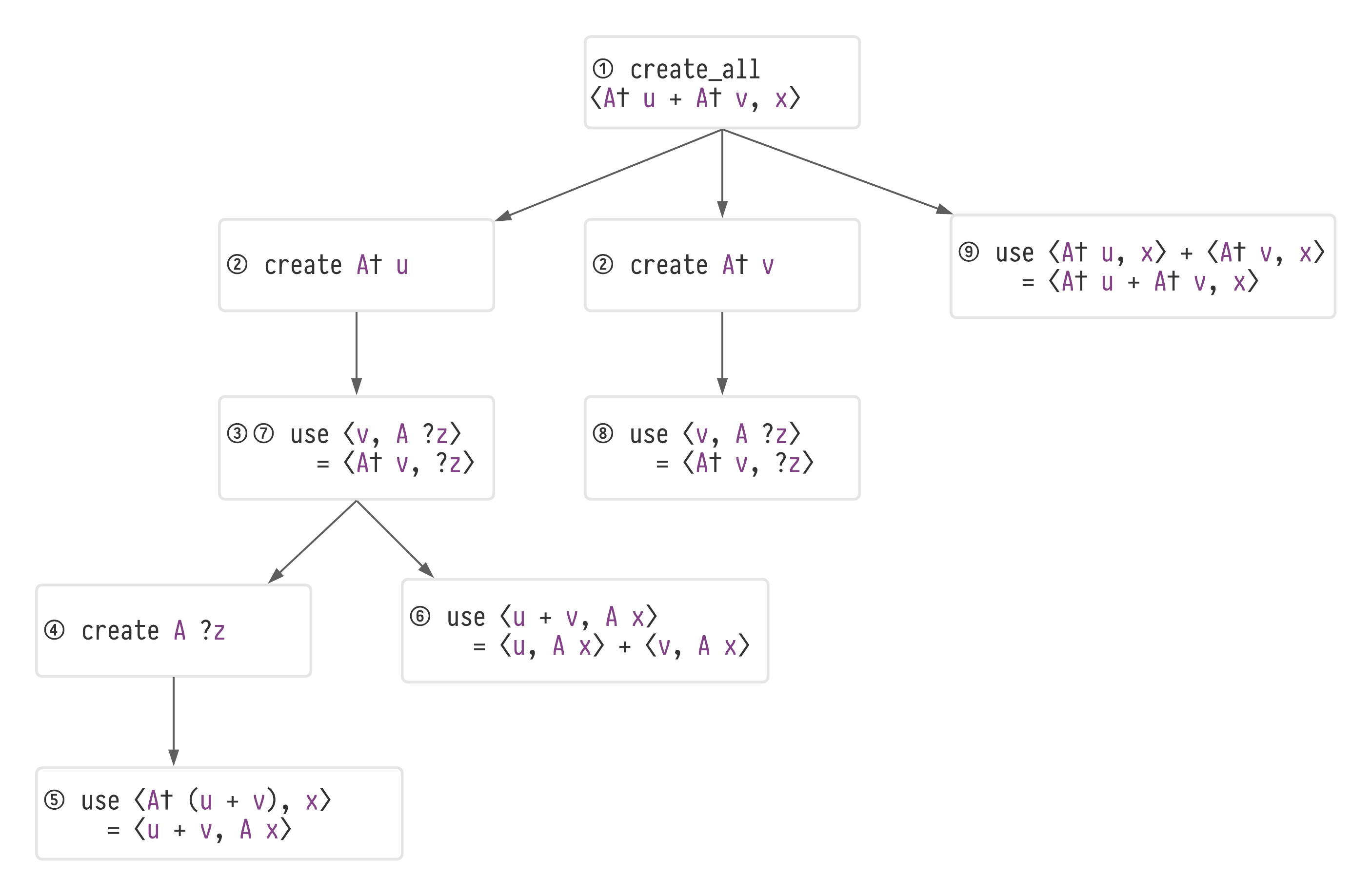 Now, there does exist a rewrite rule that will achieve create π΄ ?π§: β¨π΄β (π’ + π£), π₯β© = β¨π’ + π£, π΄ π₯β©, so this is applied and now the algorithm iterates back up the subtask tree, testing whether the new expression β¨π’ + π£, π΄ π₯β© achieves any of the subtasks and whether any new rewrite rules can be used to achieve them.
