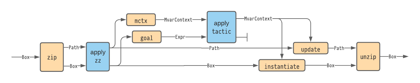 Data-flow of a Box having a tactic applied at a certain point. The Box is first zipped to produce a Path, cursor Box and metavariable context. A monad is run on this state to produce a Zipper at the required location at which point a tactic is run with the goal being the goal at the cursor. The resulting metavariable context is then used to instantiate the Zipper and unzipped to produce a new Box.